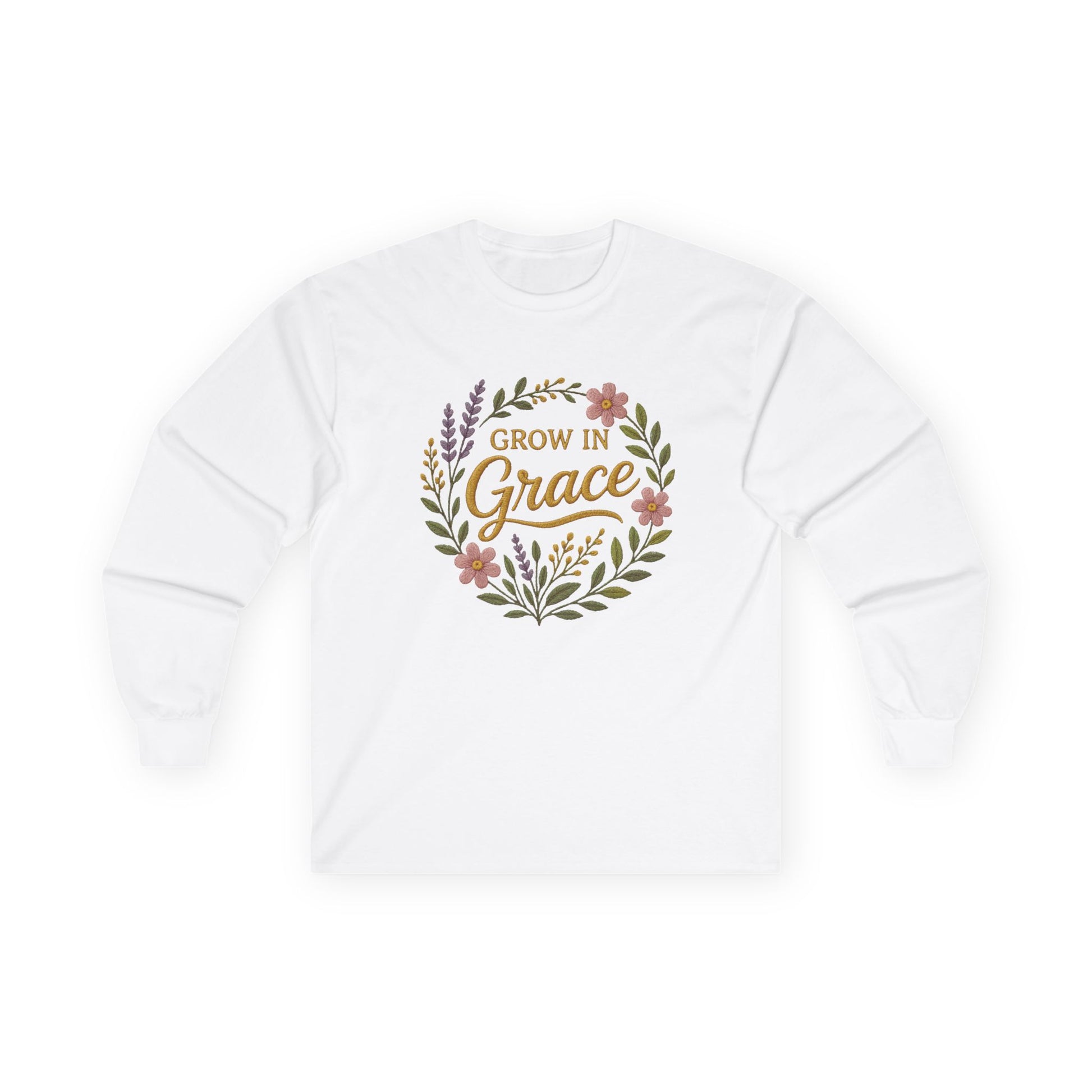 Start your day wrapped in comfort and encouragement with the Grow in Grace Long Sleeve Shirt. Designed with a soft, feminine floral wreath and uplifting faith message, this tee brings warmth to your wardrobe and truth to your everyday routine.